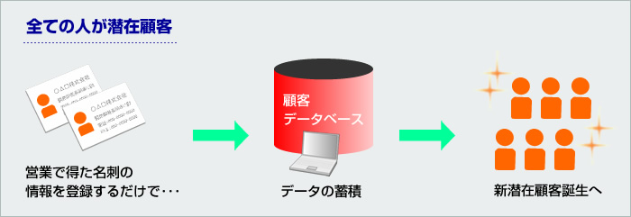通常の営業マンの持っている名刺の9割は、利用されず眠っています。この9割の潜在顧客に対して、アプローチが行えていないのが実情です。