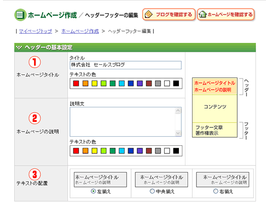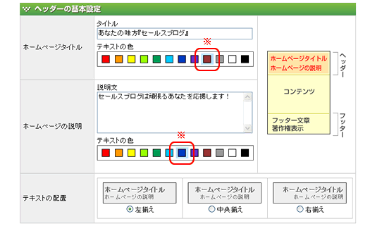 | ホームページの名称です。(タイトルタグにも反映されます) タイトルの内容とその文字の色を指定することができます。 |