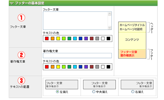 | ページの下部に表示する文章です。内容とその文字の色を指定することができます。 | |