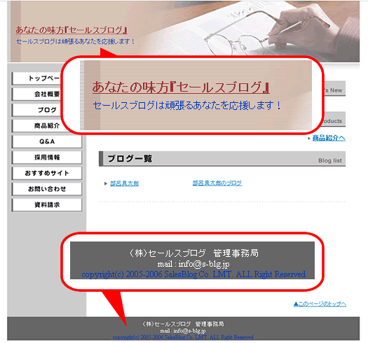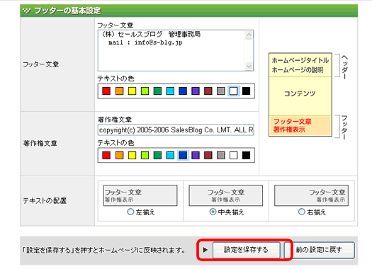 | フッター文章・著作権文章の位置を指定します。 |