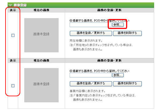所在地の右横に画像(たとえば地図や外観等)を表示させたい場合に指定します。 ※2つまで登録可能です。