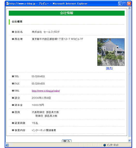 ・ 会社概要のプレビュー画面がポップアップで表示されます。