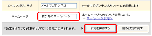 ・ ここでは、「ホームページ」 を 「我が社のホームページ」 に変更して、「設定を保存する」をクリックします。