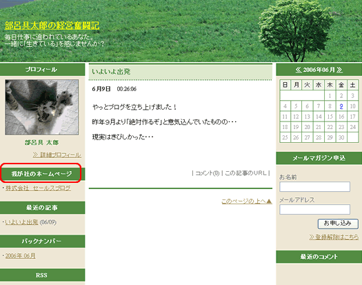 ・ サイドメニューのタイトルが「ホームページ」 から 「我が社のホームページ」に変更されています。