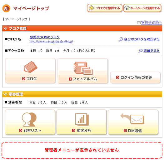 ・ 新しく追加したユーザーのマイページトップには「管理者メニュー」が表示されていません。