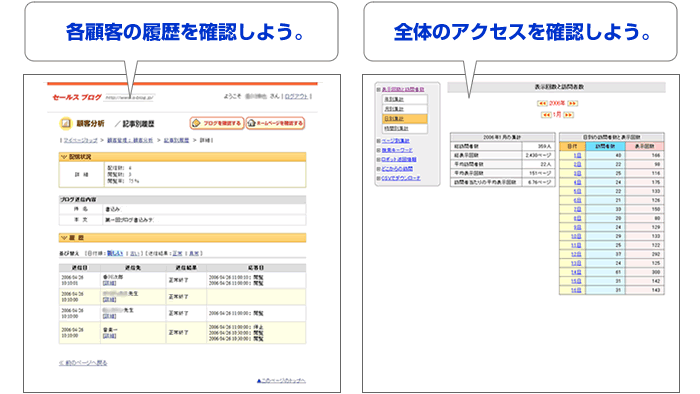 ブログへの反応は、顧客分析とアクセス解析で確認できます。